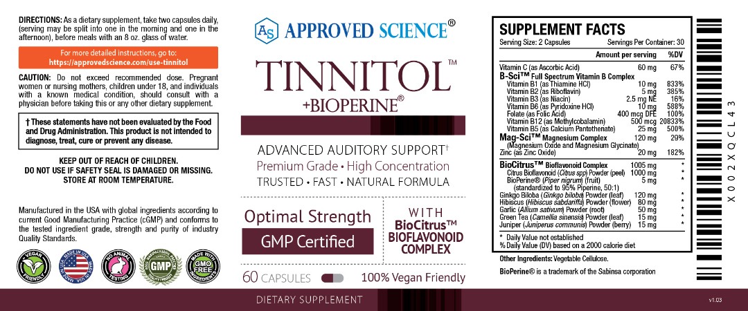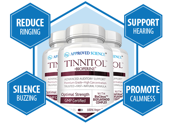 Approved Science® Tinnitol™ is an expertly crafted, tinnitus relief formula that has been scientifically formulated to support healthy inner ear function and relieve ear ringing, buzzing, and other sounds. Tinnitol™ was developed by top medical doctors and produced in a top-quality, cGMP-certified and FDA-licensed laboratory environment.